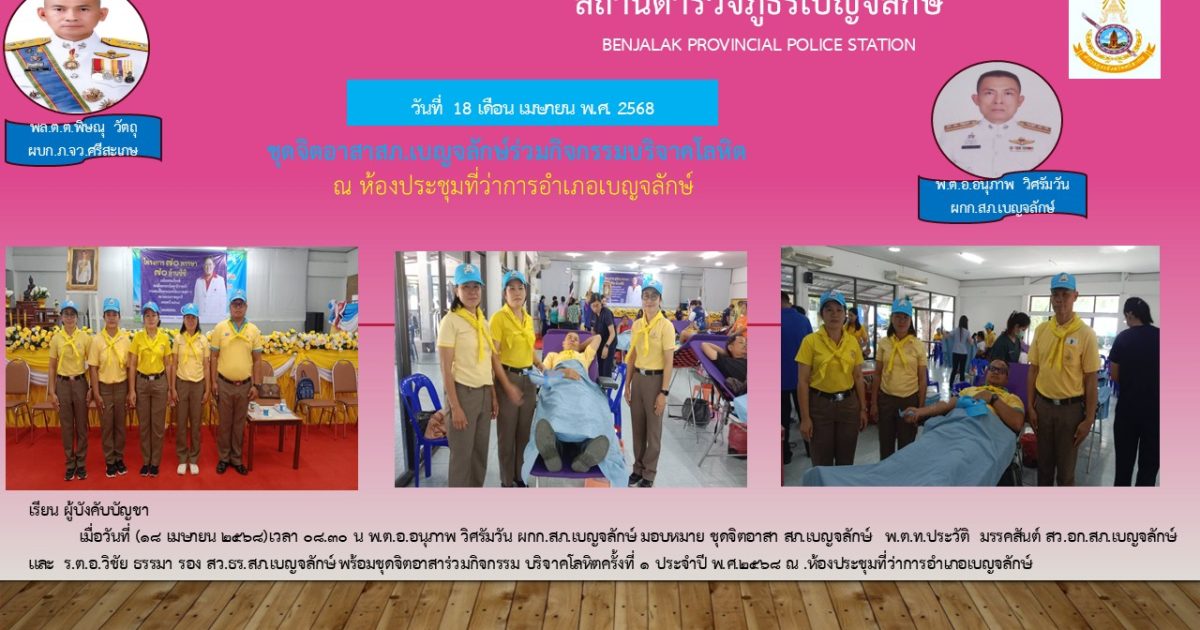 ข่าวภารกิจผู้บังคับบัญชา 03 18 เมษายน 2025 โดย ประวัติ มรรคสันต์ / ข่าวภารกิจผู้บังคับบัญชา พ.ต.อ.อนุภาพ วิศรัมวัน ผกก.สภ.เบญจลักษ์ จังหวัดศรีสะเกษ มอบหมาย พ.ต.ท.ประวัติ มรรคสันต์ สว.อก.สภ.เบญจลักษ์ ร.ต.อ.วิชัย ธรรมา รอง สว.ธร.สภ.เบญจลักษ์ พร้อมชุดจิตอาสา สภ.เบญจลักษ์ร่วมกิจกรรมบริจาคโลหิต คร้ังที่ ๑ พ.ศ. ๒๕๖๘